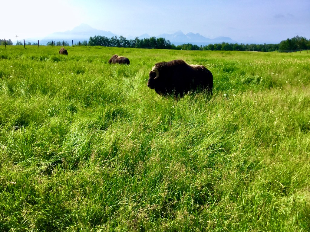The musk ox with whom I became intimate, if only briefly, was a resident of the Musk Ox Farm outside of Palmer. This sustainable agriculture organization supports the dual vision of maintenance of this iconic herd in its once natural geographic environs, and economic opportunity for Native knitters who take the collected qiviut fiber and make beautiful garments from the world’s warmest wool by weight. The organization also provides people like me with the opportunity to observe this rare artifact of a time preceding by eons the migration of our own species into the northern hemisphere.
