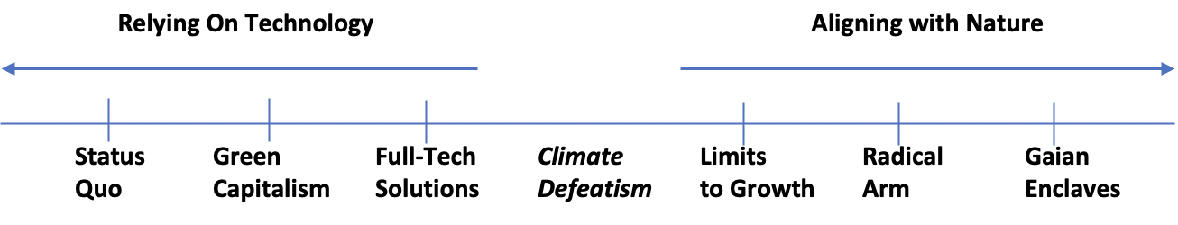 Less an approach and more of a psychological state that serves as a kind of coping mechanism, Climate Defeatism is also referred to as “doomerism.” It holds its place on the continuum of approaches to the climate crisis because for many individuals, and even for some institutions, it’s a very real (though immobilizing) response to what is happening on a global scale.
