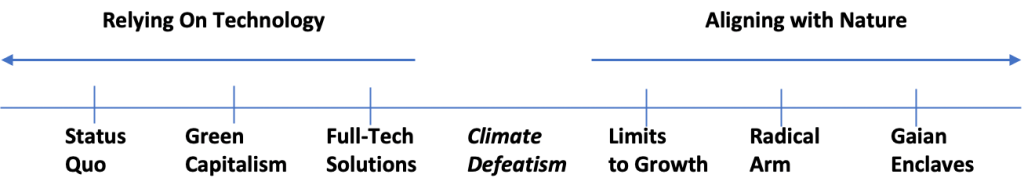 In thinking through the proposed approaches to the climate crisis, I’ve conceptualized a continuum as a way to explore the current alternatives. Most people will find most of these approaches unsatisfactory for a variety of reasons. But we are at a fork in the road and we will be taking a path together, whether we consciously come to consensus on one or not, because whatever we do relative to climate disruption, the consequences of these efforts are planetary.