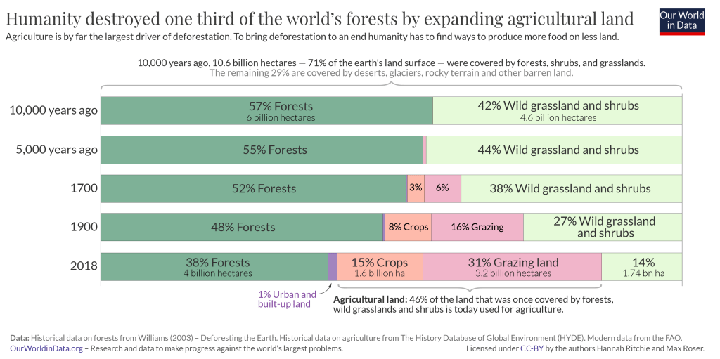 In the past 500 years (not that long ago — about the time Columbus made landfall on what is now the Bahamas), the human population on Earth has grown from around 500 million people to around 8 billion people. Over that same period, at least 800 vertebrate species were lost from the biosphere due to human activity. In a little more than the past 100 years, the Earth lost as much of its forests as it had in the last 9,000 years. Again this was primarily due to human activity. Humans have been cutting down trees for millennia, but it’s the change from hunter/gatherer activities to those of agriculture and the exponential growth in population size has that has made this untenable for the Earth’s inhabitants (very short-sightedly including ourselves).